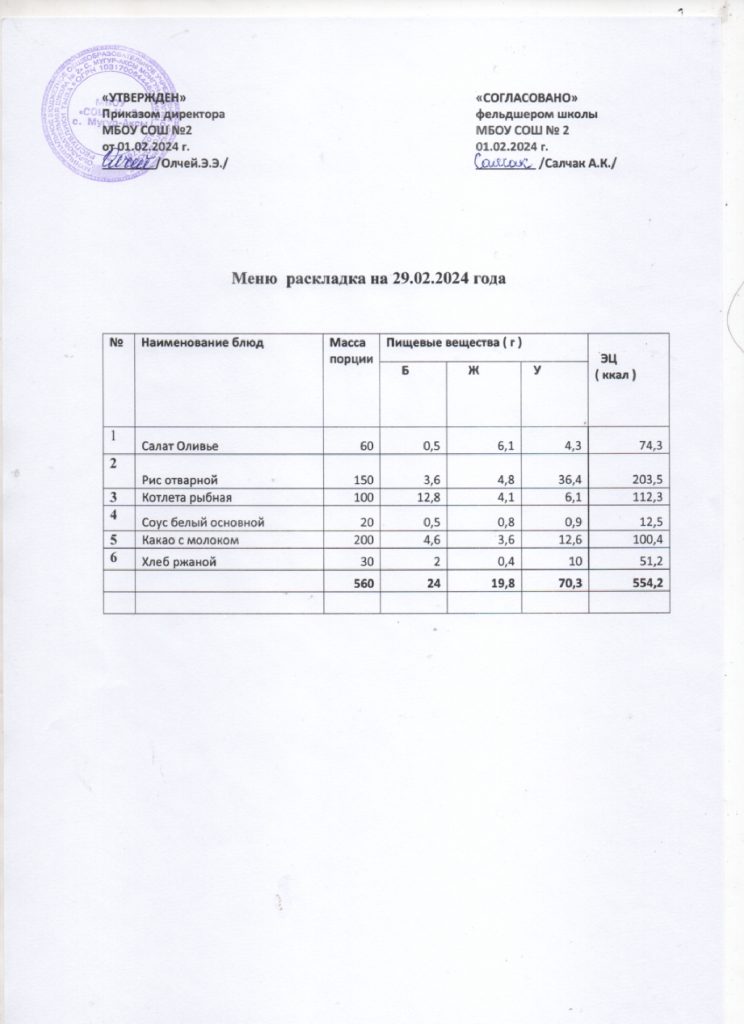 Контрольное меню на 29.02.2024